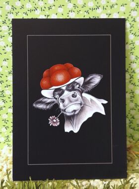 Postkarte Schwarzwald Kuh Hilda mit Blume und Bollenhut