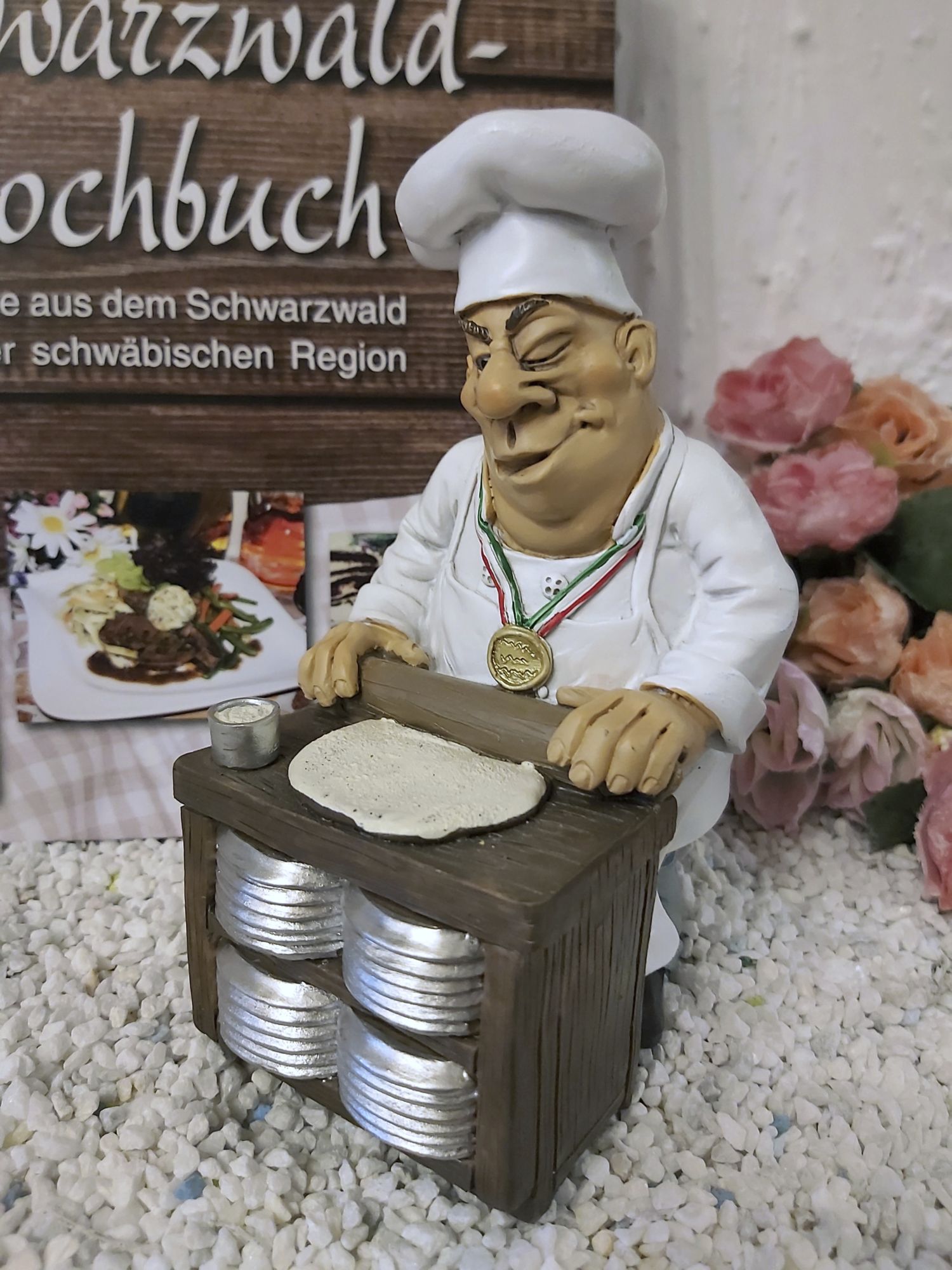 Mit einer Figur des: Pizza Bäckers am Pizzatisch