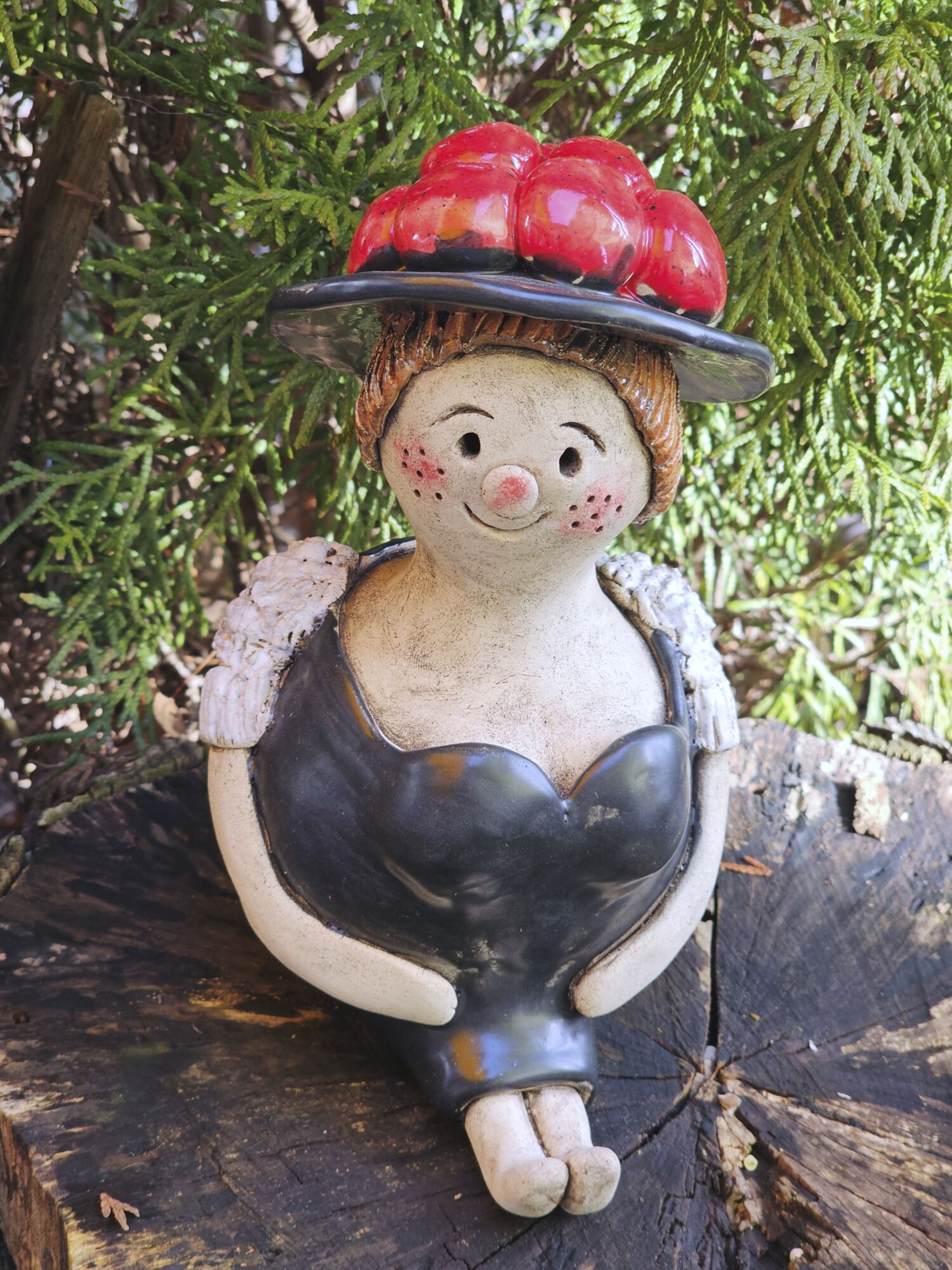 Tonfigur Schwarzwälderin sitzend mit rotem Bollenhut