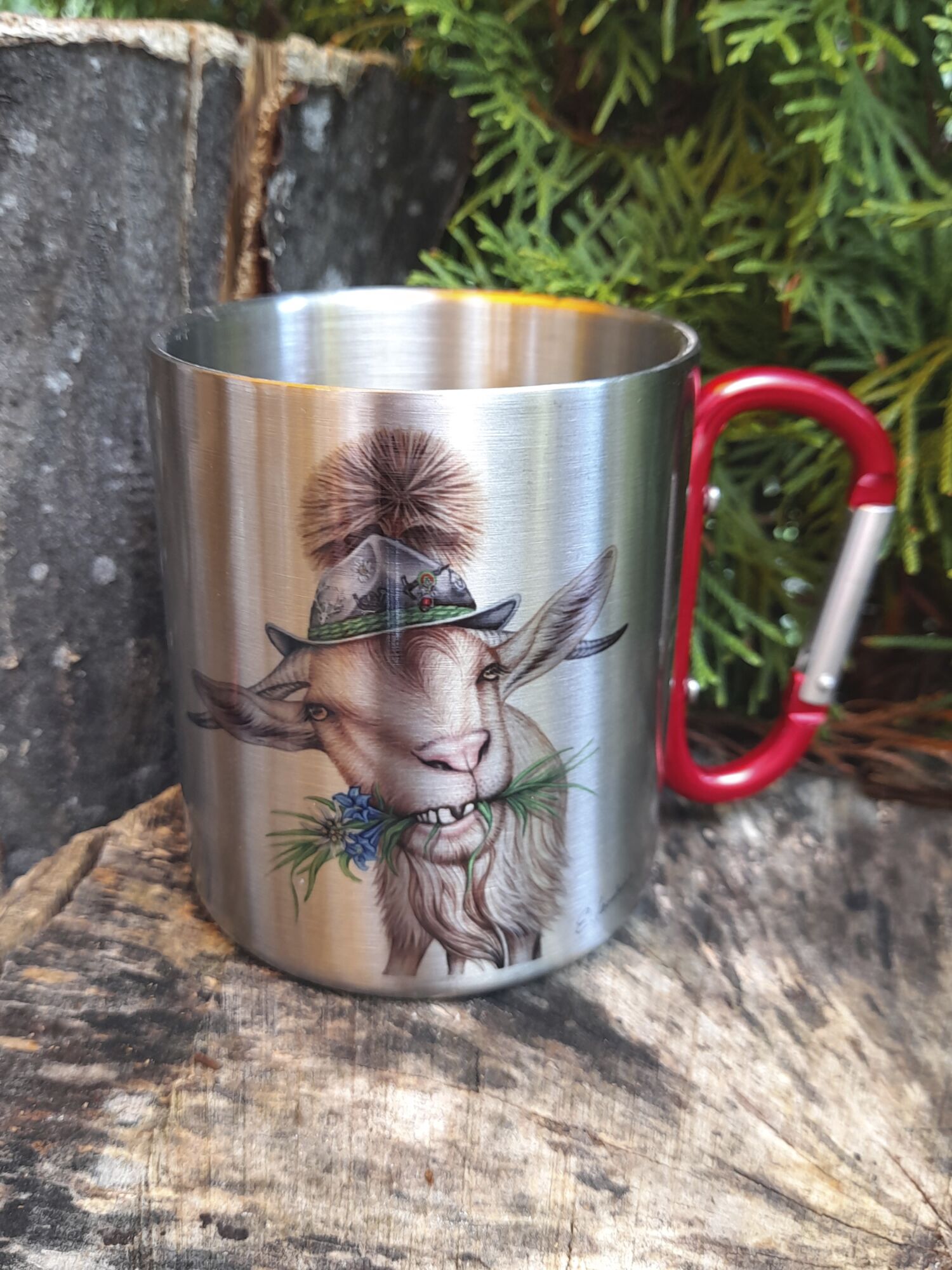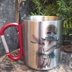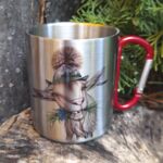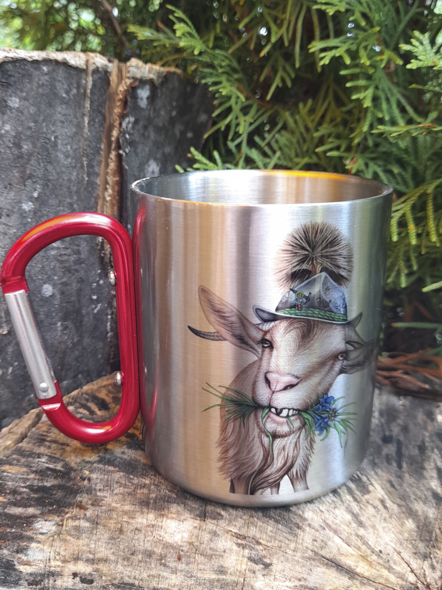 Hochwertige Edelstahltasse mit Karabiner und toller Farbbrillianz