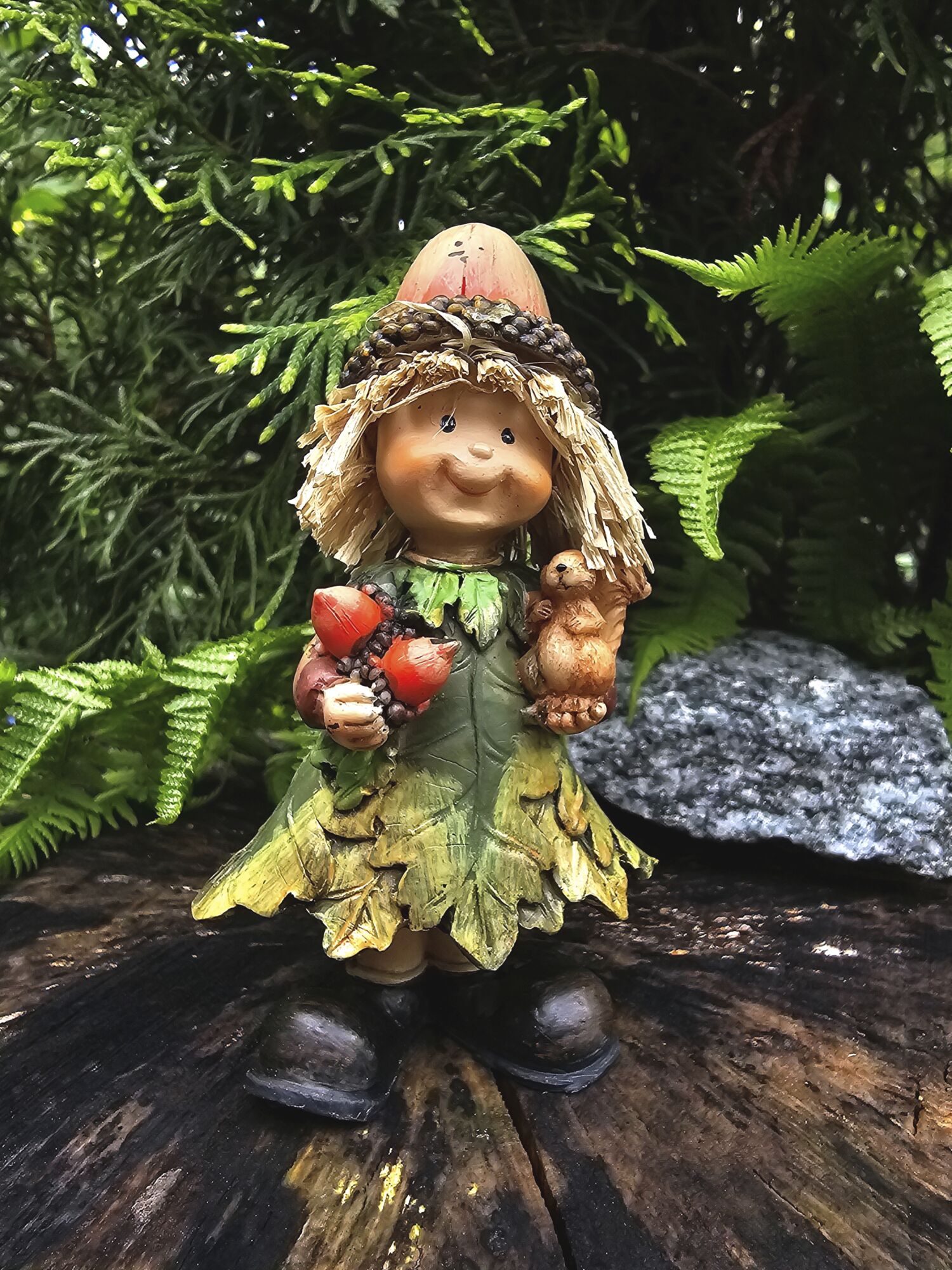 Ganz bezaubernde Waldwichtele mit Eichelhut und einem süßen Eichhörnle und Eicheln in der Hand.